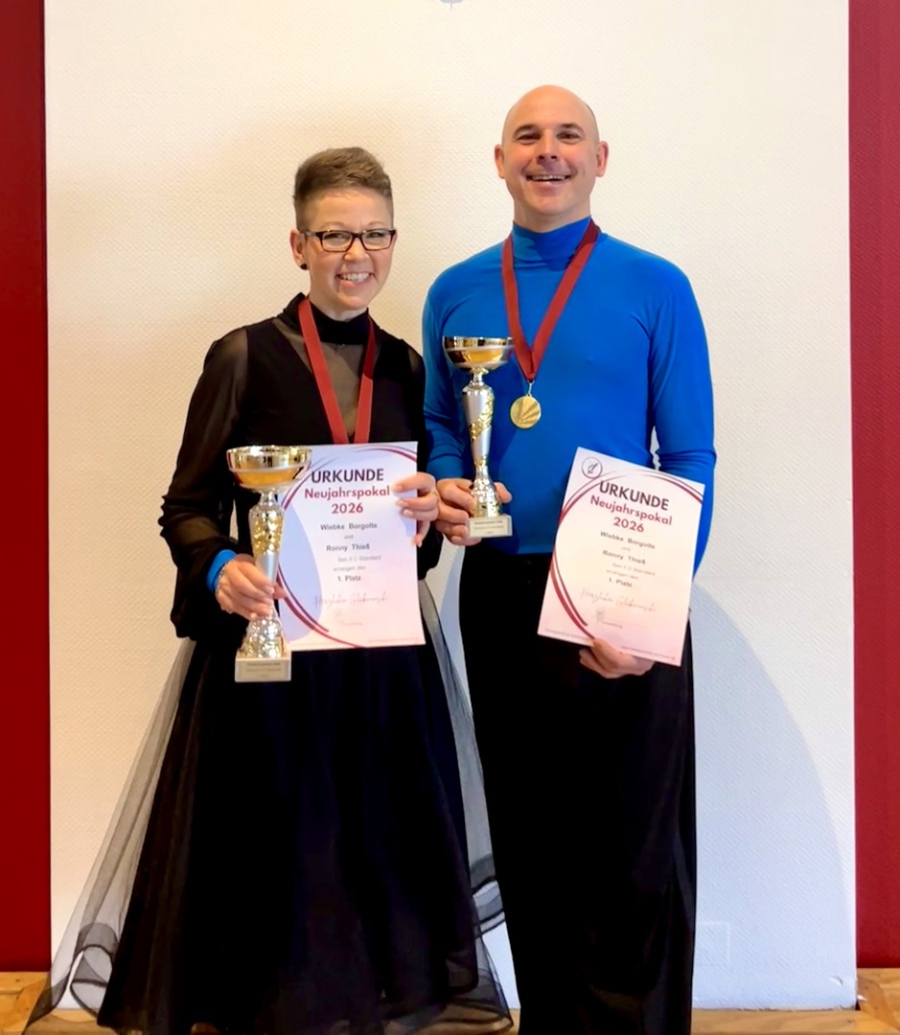 Wiebke Borgolte und Ronny Thieß haben den Neujahrspokal beim Tanzsportclub Dortmund geholt, und zwar gleich zweimal: Als Siegerpaar im Sen II D Turnier und - weil sie mit diesem Sieg in die