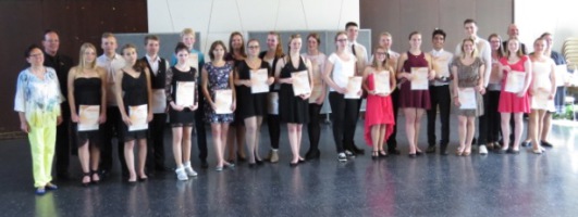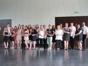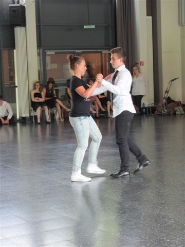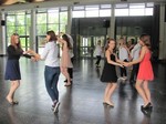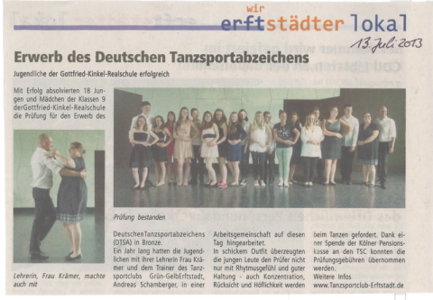 2. Juli 2013: Völlig verwandelt - die Herren in schwarz-weiß und die Damen im Cocktailkleid - erschienen 11 Paare der Klassen 9, die heute die Prüfungen für den Erwerb des Deutschen Tanzsportabzeichens (DTSA) in Bronze absolvieren wollten. Die Zuschauer staunten nicht schlecht, als sie darüber hinaus Jugendliche erlebten, die Haltung zeigten, höflich waren, zuhören und sich konzentrieren konnten, Rhythmusgefühl, Rücksicht und Empathie zeigten! Ein Jahr lang hatten die Schülerinnen und Schüler gemeinsam mit Frau Krämer und dem Tanztrainer des Tanzsportclubs Grün-Gelb-Erftstadt, Andreas Schamberger, in einer Arbeitsgemeinschaft auf diesen Tag hingearbeitet. Alle absolvierten die Prüfung mit Erfolg. Der Tanzsportclub Grün Gelb Erftstadt gratuliert den Teilnehmerinnen und Teilnehmern ganz herzlich.