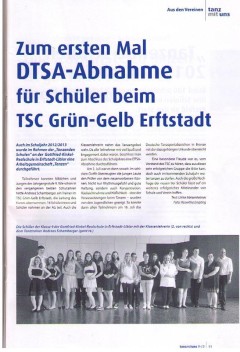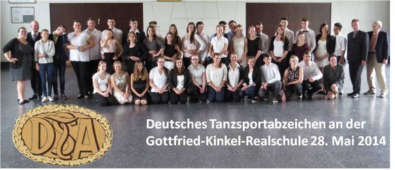 28. Mai 2014: 38 Schülerinnen und Schüler der Stufen 9 und 10 der Gottfried-Kinkel-Realschule in Liblar und die für die Tanz-AG zuständige Lehrerin stellten sich am Nachmittag den Prüfungen zum Erwerb des Deutschen Tanzsportabzeichens. Die Schüler hatten sich im zurückliegenden Schuljahr mit ihrem Trainer, Andreras Schamberger, intensiv auf diese Prüfung vorbereitet. Mit viel Taktgefühl überzeugten sie das als Prüfer eingesetzte Ehepaar Schamberger von ihrem Können. Gerd Krautwald, der DTSA-Beauftragte des TSC, hatte mit seiner guten administrativen Vorbereitung für einen reibungslosen Ablauf gesorgt.